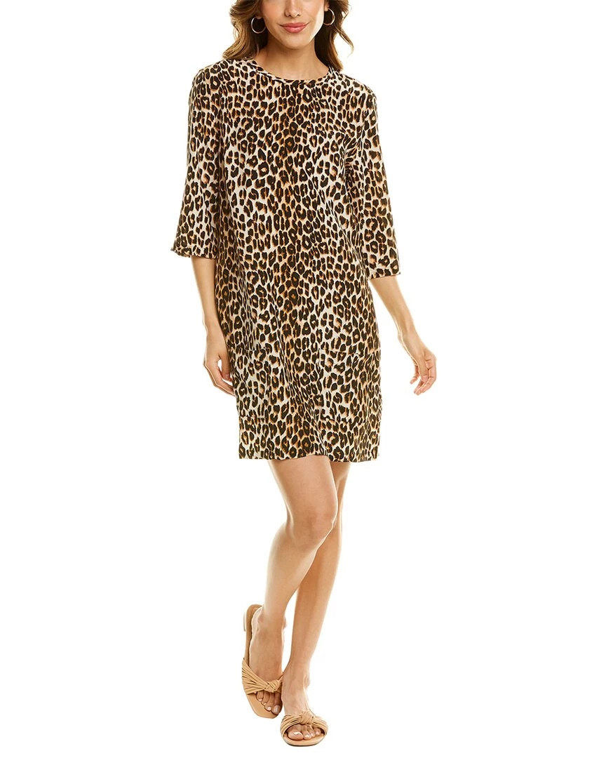 - Aubrey Silk Shift Dress In Leopard Print With 3/4-Length Sleeves, Two Front Pockets, And Tie Sash At Waist