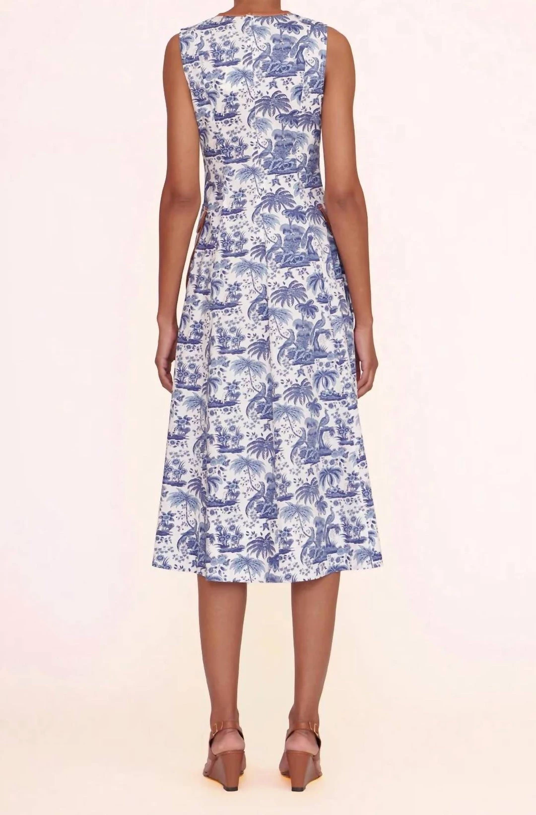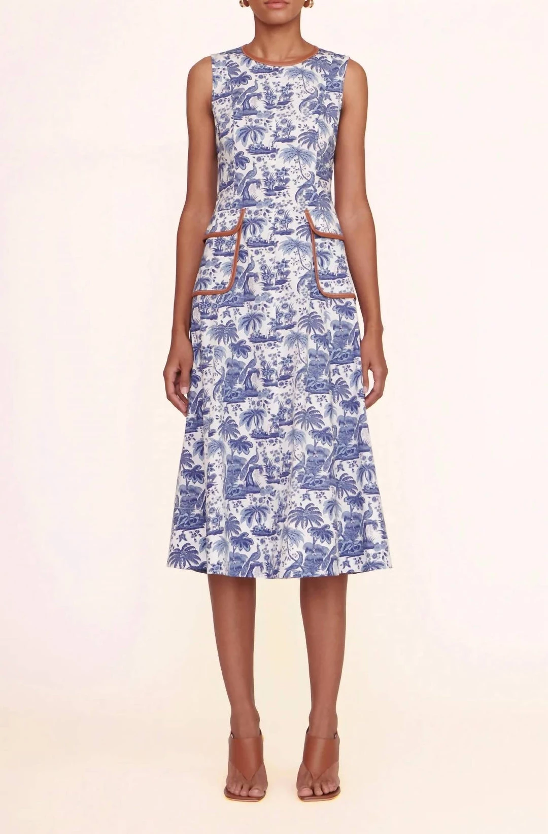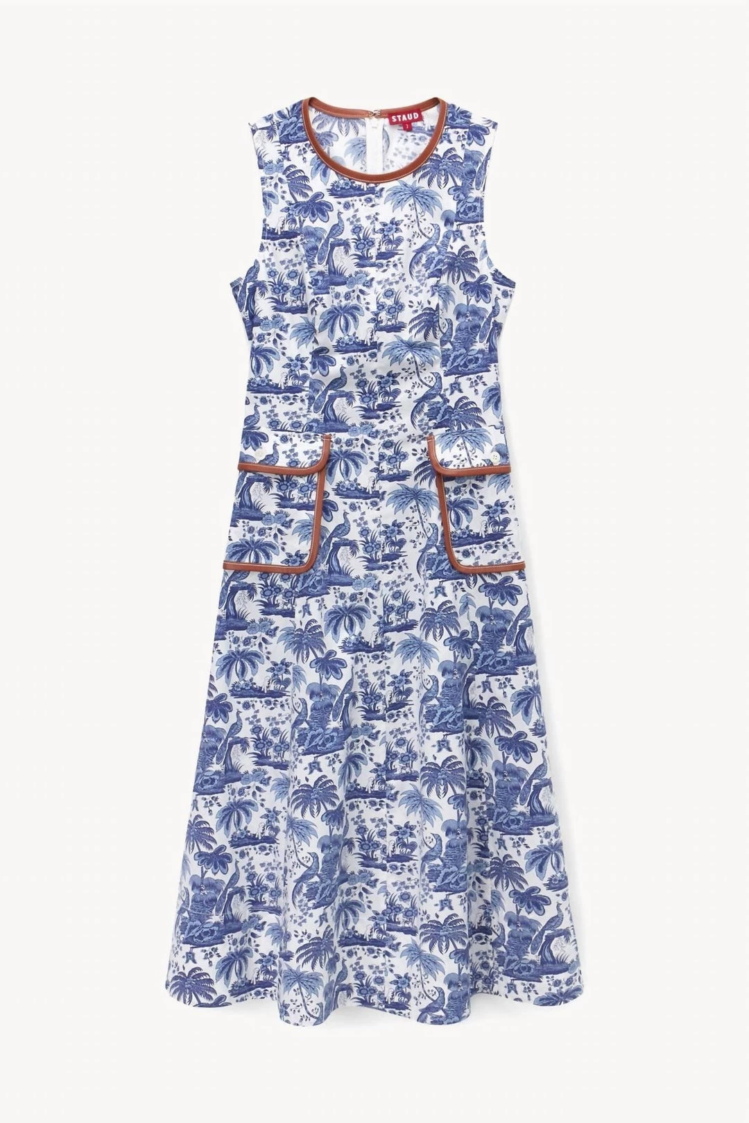 Midi-length toile poplin dress featuring two vegan leather trimmed front pockets. Sleeveless with a high neckline, fitted bodice, and flared skirt.