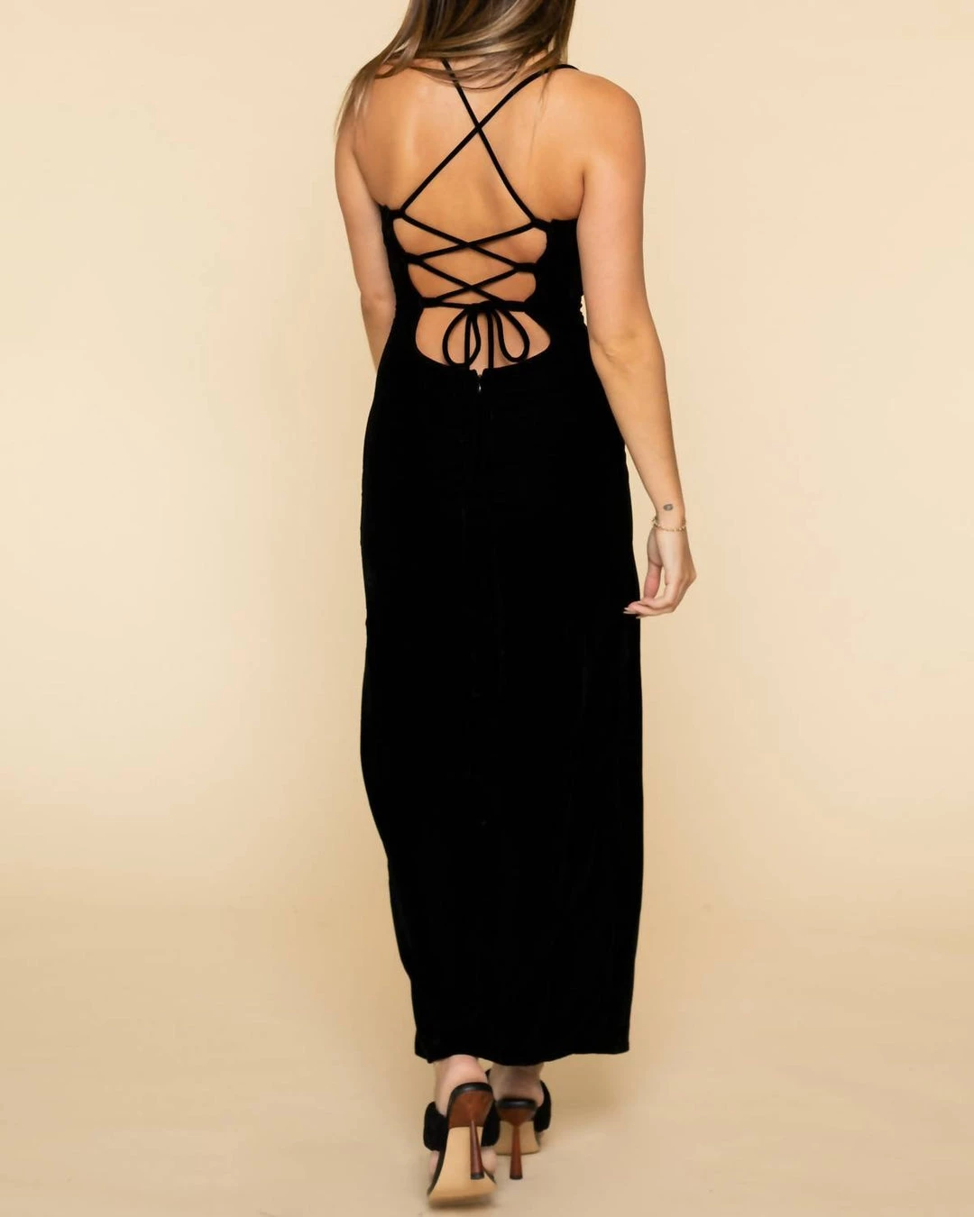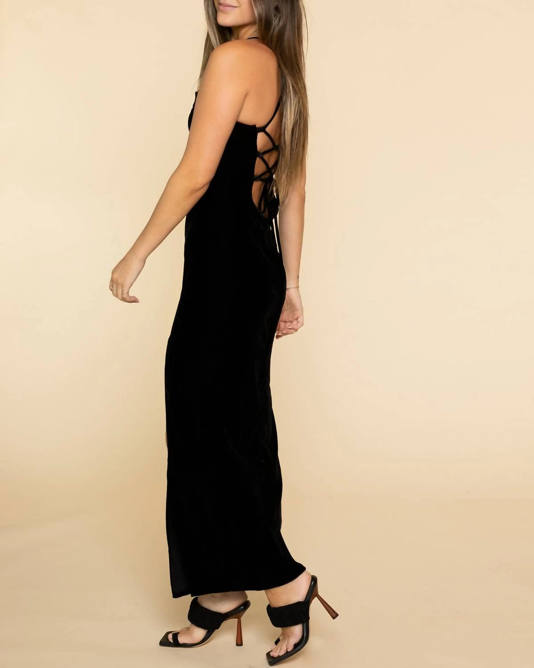 A midi-length slinky velvet dress, the Bellamy features a cowl neck and an adjustable lace up back.
