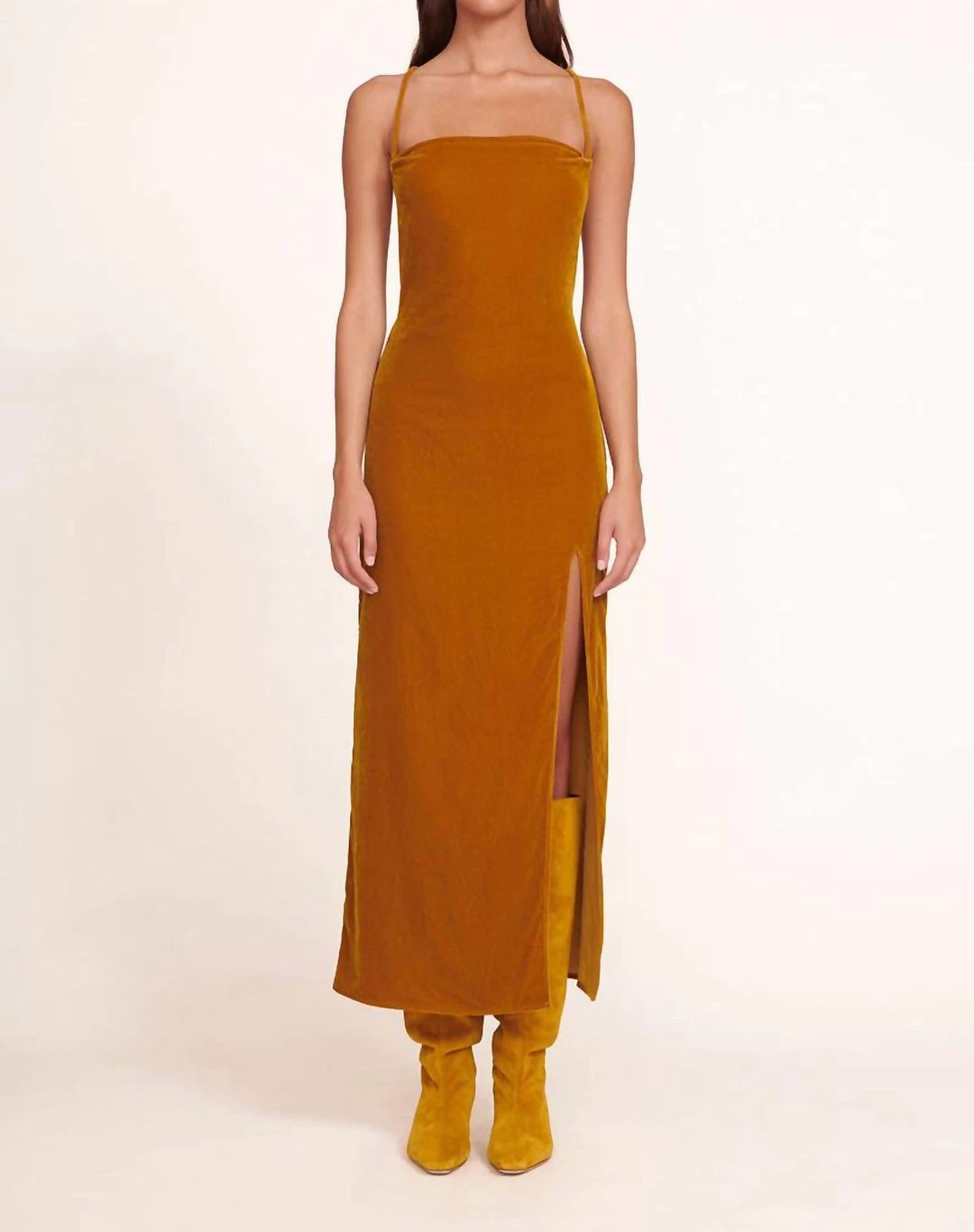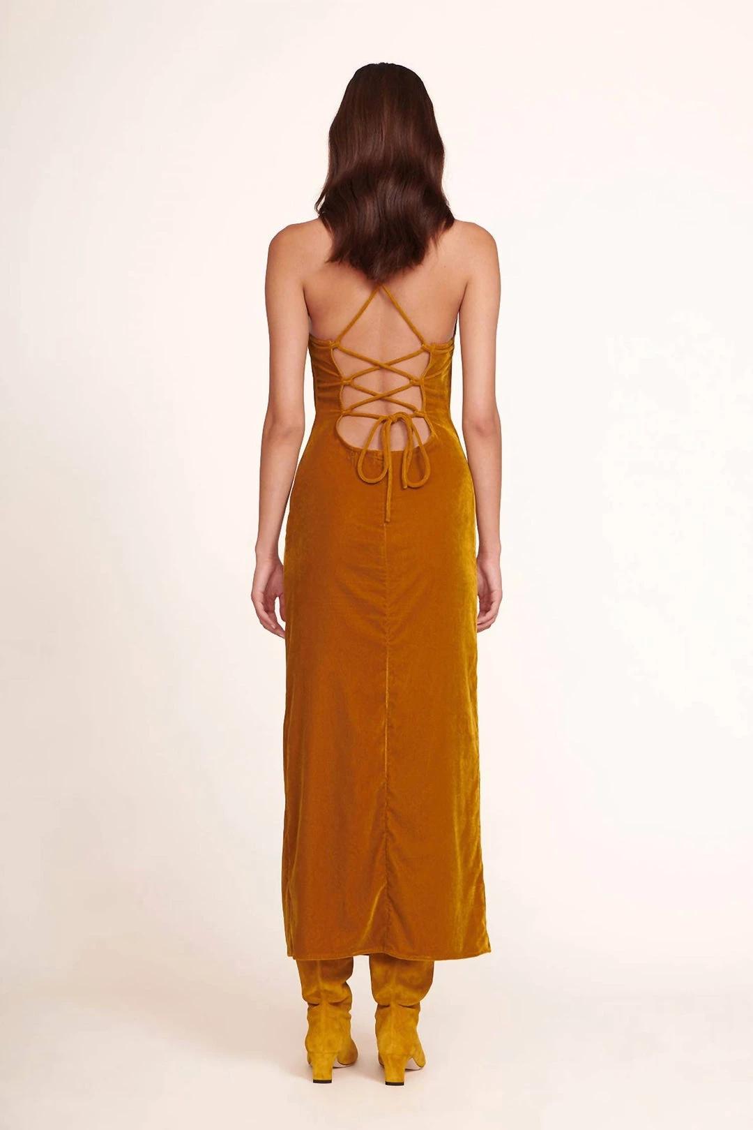 A midi-length slinky velvet dress, the Bellamy features a cowl neck and an adjustable lace up back.